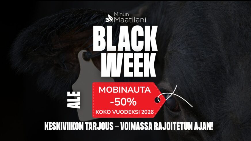 Tarjous koskee vain ke 26.11.2025 tehtyjä uusia tilauksia. Alennus lasketaan vuoden 2026 hinnoista. Tarjous ei koske asiakkaita, joilla on ollut sama tuote käytössä jo vuonna 2025. Tilatessasi ohjelman saat hankintakuukauden ja sitä seuraavan kuukauden veloituksetta. Minun Maatilani -sovelluksen kautta tilatessa tarjous tulee voimaan automaattisesti, koska tarjouskoodikenttää ei ole ohjelman sisällä.