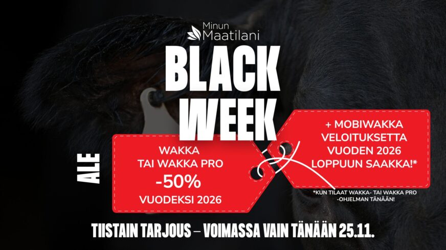 Anna tarjouskoodi BF2025 tilatessasi. Tarjous koskee vain ti 25.11.2025 tehtyjä uusia tilauksia. Tarjous ei koske asiakkaita, joilla on ollut sama tuote käytössä jo vuonna 2025. Tilatessasi ohjelman saat hankintakuukauden ja sitä seuraavan kuukauden veloituksetta. Minun Maatilani -sovelluksen kautta tilatessa tarjous tulee voimaan automaattisesti, koska tarjouskoodikenttää ei ole ohjelman sisällä.