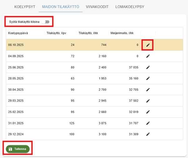 Maidon tilakäyttö ilmoitetaan nyt omalla välilehdellään, ja kotikulutuksen voi ilmoittaa myös kiloina (kuva 5).
