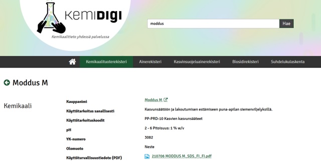 Kuva 2. KemiDigin kasvinsuojeluainerekisterissä voit tutkia valmisteiden tietoja tarkemmin.