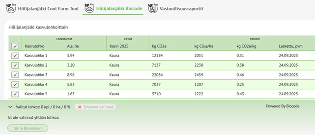Kuva 2. Esimerkki viiden kauralohkon tuloksista Biocoden laskentapalvelulla laskettuna. Laskennassa on huomioitu kasvulohkoille Wisu Pro:hon kirjatut muokkaukset, kylvöt, lannoitukset, kasvinsuojelut sekä sadonkorjuu.