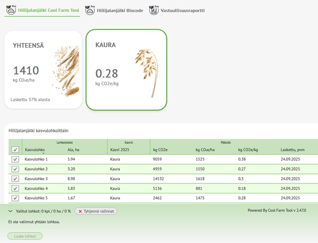 Kuva 1. Esimerkki Cool Farm Tool -laskennan tuloksista viidellä kauralohkolla. Laskennassa on huomioitu kasvulohkoille Wisu Pro:hon kirjatut muokkaukset, kylvöt, lannoitukset, kasvinsuojelut sekä sadonkorjuu.