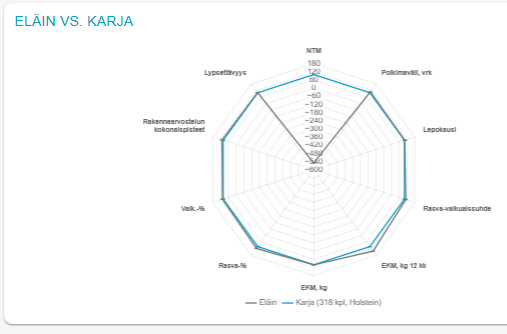 Välilehdeltä löydät myös tuotokset listattuna, eläimen sijoittuminen karjassa suhteessa karjan muiden samanrotuisten keskiarvoihin (kuva 5).