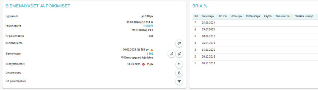 Kuva 3. Siemennykset ja poikimiset sekä Brix% ovat nyt tapahtumat-välilehdellä.