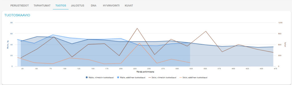 Kuva 4. Tuotoskaavio näyttää aikajanalla tiedot eläimen tuotoskauden tuotostiedoista