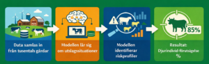 För att detta ska fungera krävs en omfattande historisk databas. När modellen tränas med verkliga utslagningar från tusentals besättningar och de datapunkter som föregick dem, börjar den identifiera riskprofiler som en enskild lantbrukare varken hinner eller kan uppfatta i vardagen. Resultatet är en procentuell sannolikhet per djur – en utslagningsprognos som uppdateras automatiskt när ny data tillkommer.