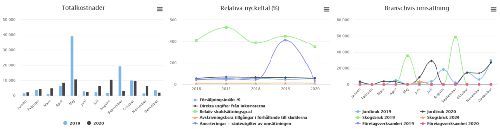 Bild 2. På framsidan finns också graferna: Totalkostnader, Relativa nyckeltal och Branschvis omsättning.