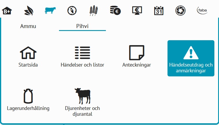 Händelseutdraget som syns på framsidan av nötprogrammet i Min Gård sammanfattar till en helhet de anmälningar som sparats i nötregistret under en månad. Händelserna kan vara t.ex. födelser, utmönstringar och flyttningar. På händelseutdraget ser du snabbt med ett ögonkast hurdan den aktuella situationen är. Du kan t.ex. kontrollera om det för de djur som hämtats igår har gjorts en utmönstringsanmälan. Till händelseutdraget kommer man via den övre menyn (bild 1) eller via den lilla sammanfattningsrutan (bild 2) som syns på nötprogrammets framsida.