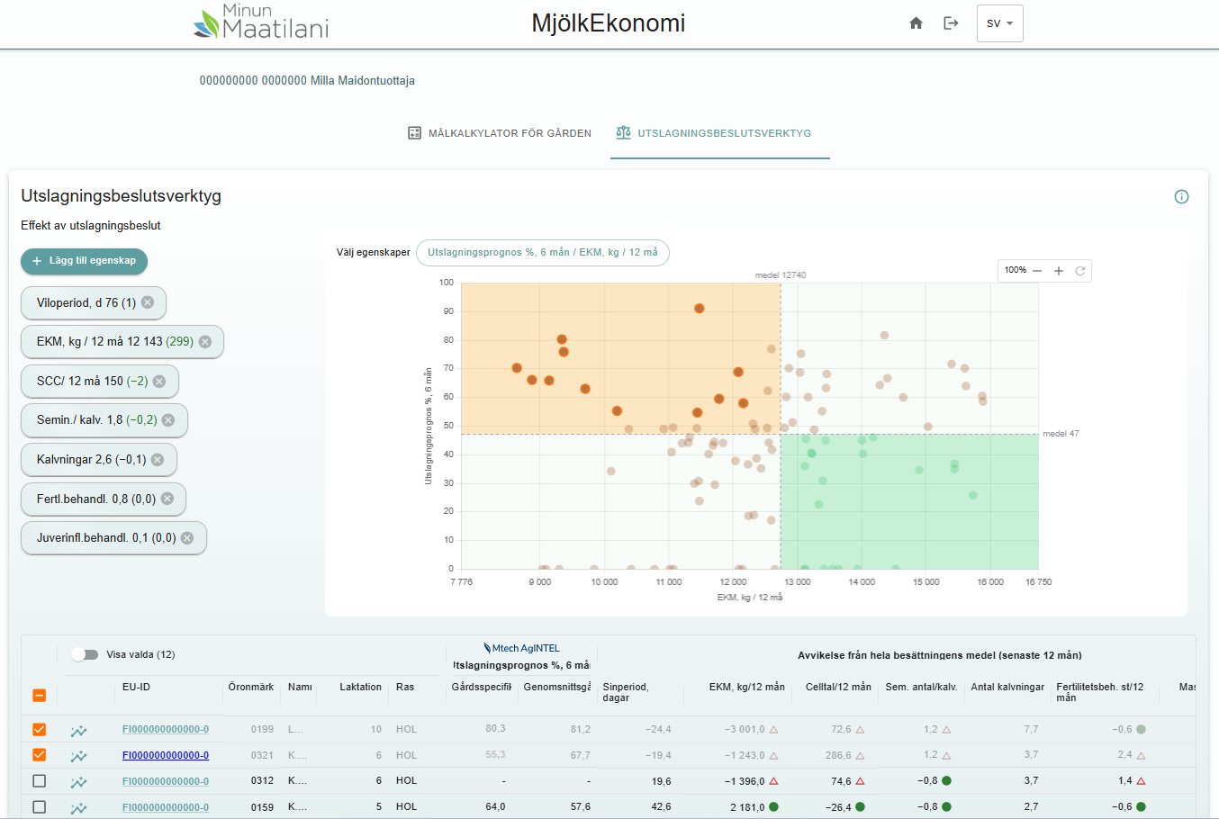 Utslagningsbeslutsverktyget, som bygger på Mtechs AgINTEL-prognosmodeller, använder AI-baserade lösningar för att lyfta fram de djur vars utslagningsrisk och ekonomiska påverkan du bör beakta i god tid.