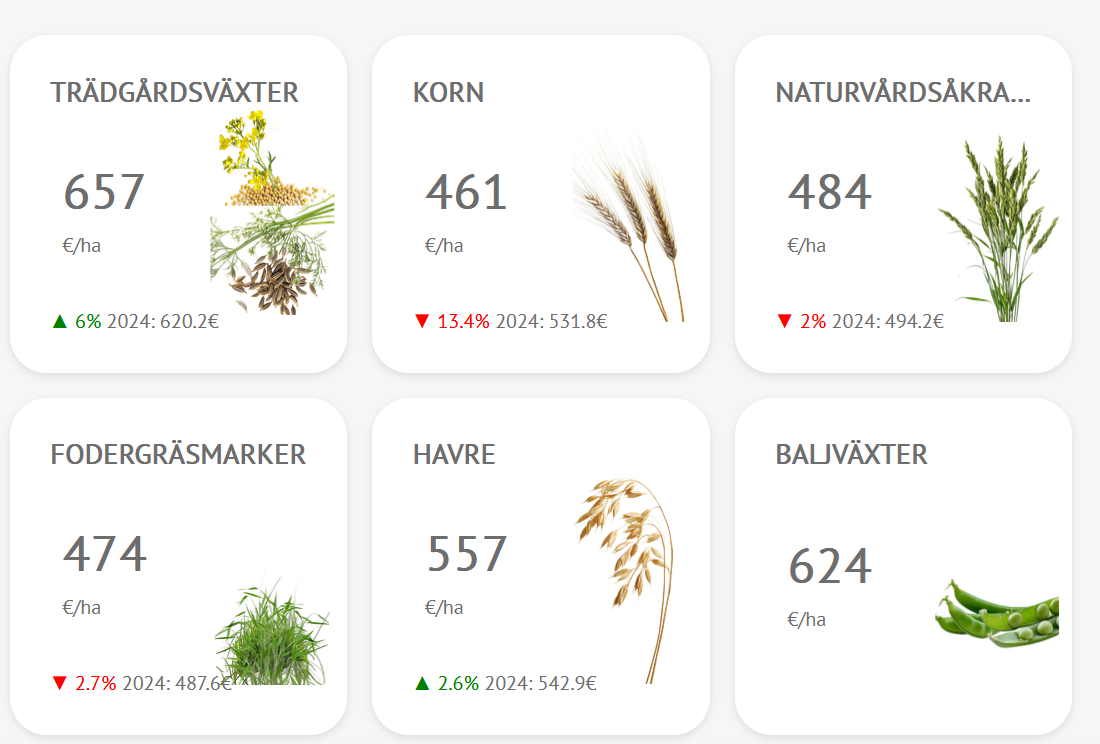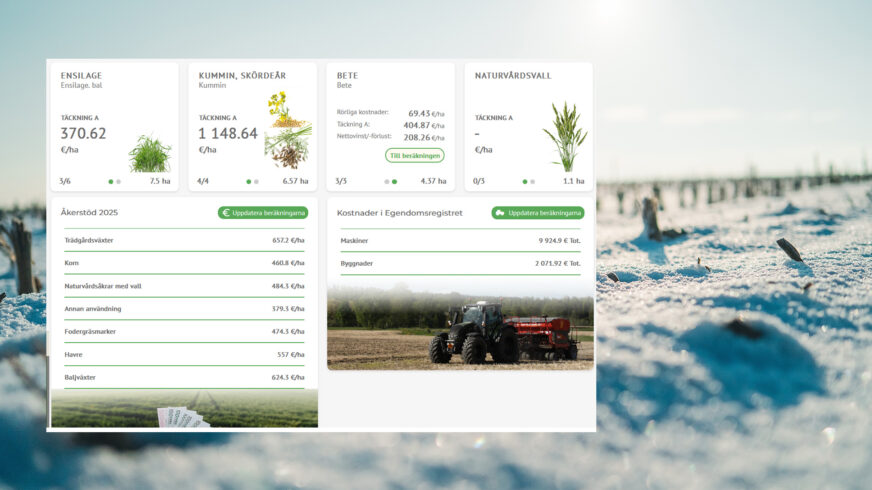 Bild 1. Åkermarkstödsberäkning summerar de olika stöden per gröda och beaktar de miljöersättnings- och ekosystemåtgärder som genomförts på skiftena, såsom till exempel fånggrödor och vintertida växttäcke.